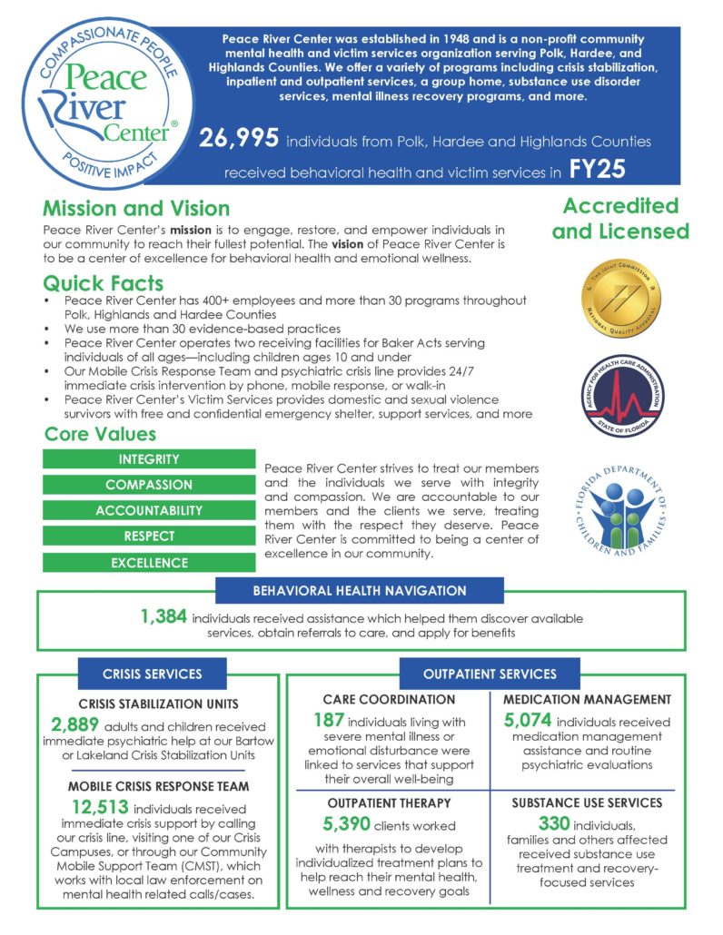 The vision of Peace River Center is to be a center of excellence for behavioral health and emotional wellness.